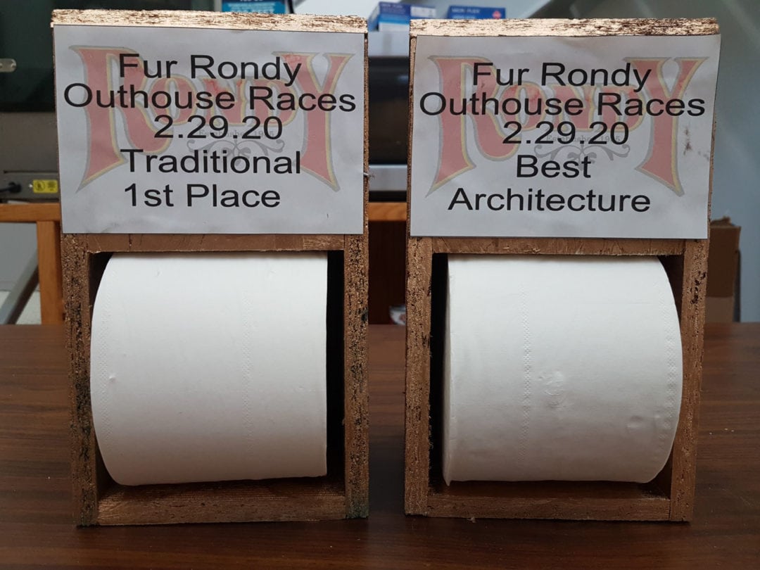 So, what prize could prompt grown men and women to push outhouses down the road in freezing temperatures? Toilet paper, of course. Each team that wins, either overall or a specialty category, is awarded a miniature outhouse toilet paper roll holder.